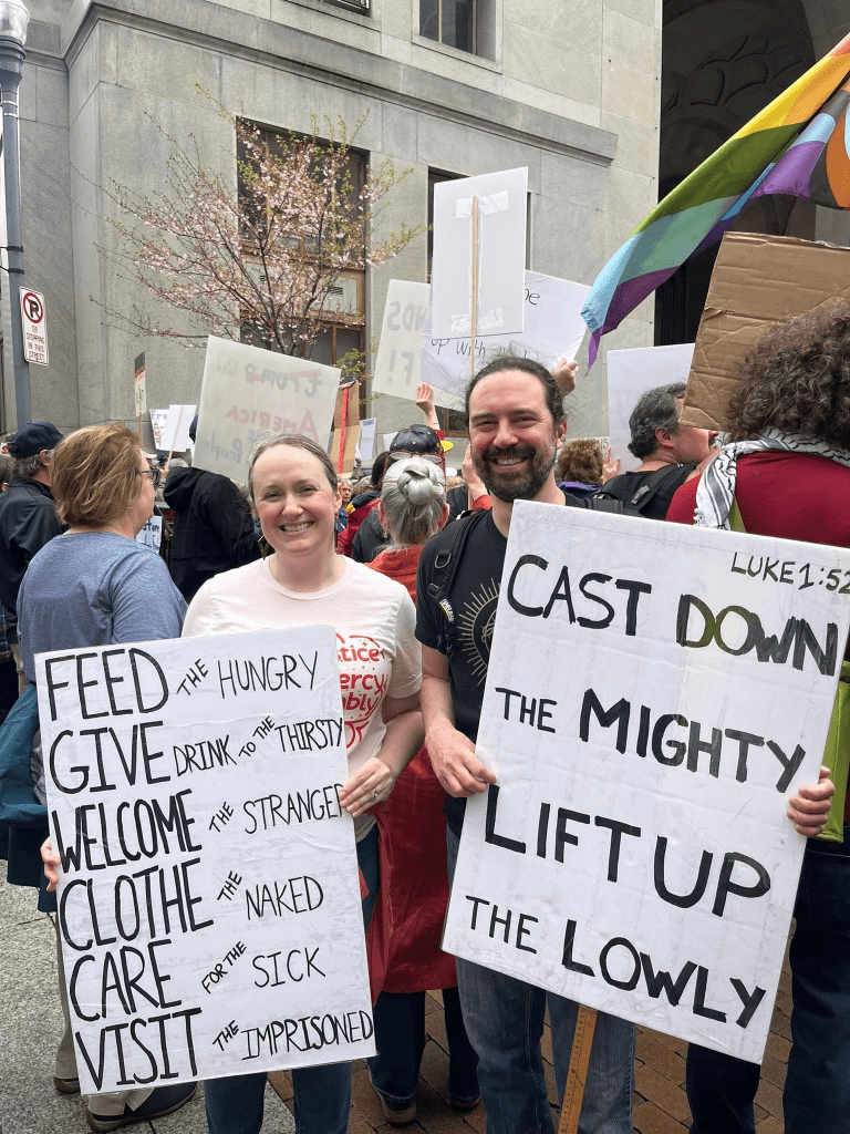 “I joined the national Hands Off! protest in Pittsburgh today because the social teachings of my Catholic faith put me at odds with many of the current administration’s policies….As an associate with the Sisters of Mercy of the Americas, I chose to write the corporal works of mercy on my sign. These are things I intentionally strive to do in my daily life, and I believe that it is the responsibility of a government to do the same for all of its people as we strive to protect the right to life, liberty, and the pursuit of happiness for all human beings without exception. The corporal works of mercy come from the passage from the Gospel of Matthew [which states that] the way we treat the poor is the way we treat Christ (Matthew 25:31-36).”
