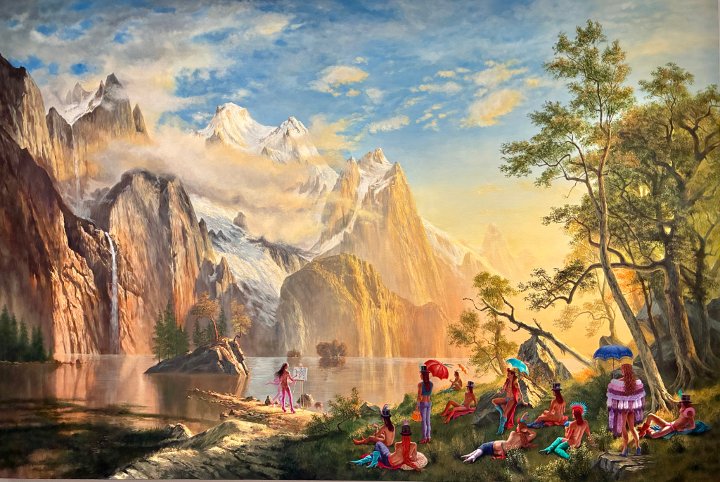These works, though beautiful, mythologized the West and fostered the idea that these were empty lands open to European settlers. Monkman does a fantastic job at flipping this on its head—he recreates Bierstadt’s landscapes but includes Indigenous people and white settlers inhabiting them, creating “dialogues between different kinds of work across periods of time,” he said.
