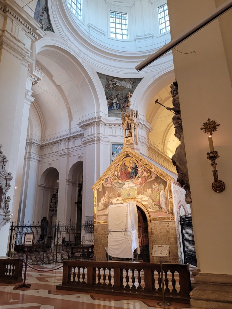 Weeks later, I sat with my spiritual director and told him about the emotional reaction I had to the Portiuncula, still puzzled by the experience. In his gentle and astute way, he asked me about the meaning of the Portiuncula, which is now housed inside a giant Basilica. I told him how the early friars lived in huts surrounding the Portiuncula and the tiny church was the center of their fraternity. During that time, it was in the swamp, outside the security of the Assisi walls. The early Franciscan community was simple, small, and lovingly present to those whom the village of Assisi didn’t care for, who they despised and considered dead: lepers.