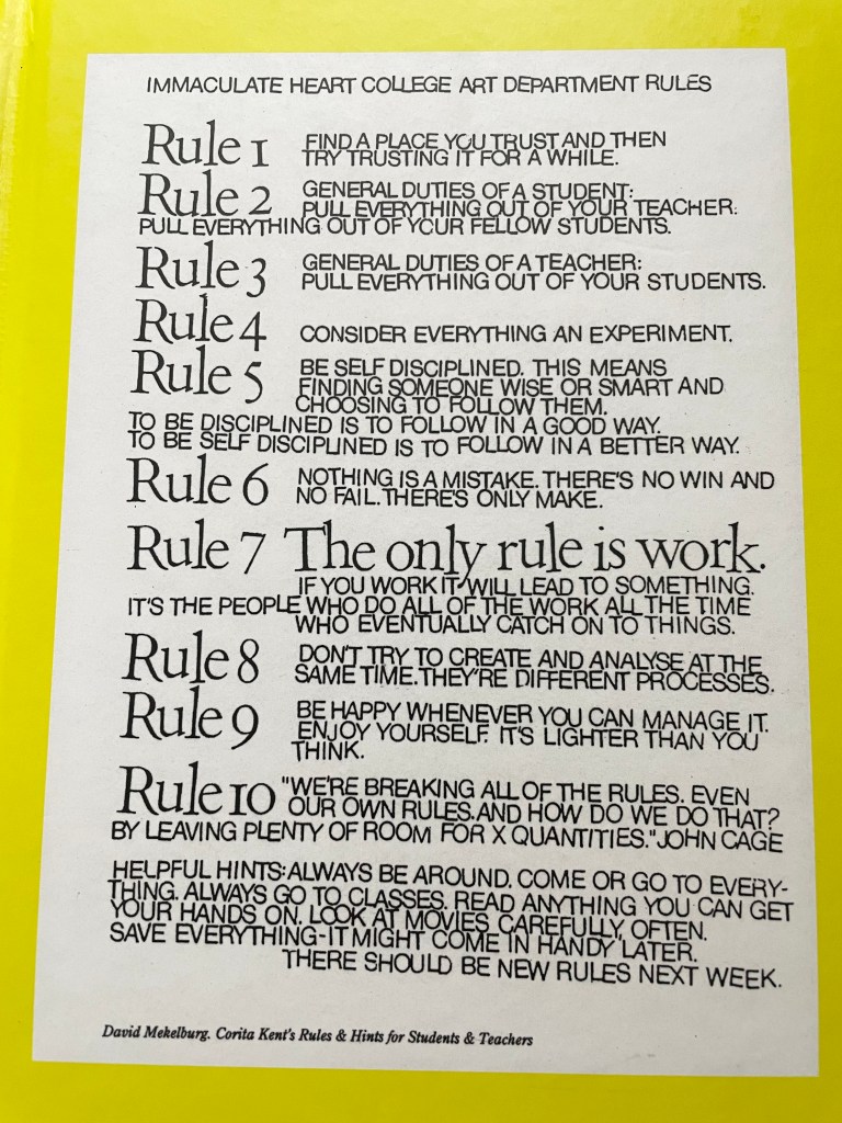 Kent made the “Immaculate Heart College Art Department Rules” for her classroom. These rules are a reliable reset for my heart. Yes, this is what it’s all about, I think after reading. For Kent, art and creativity were never about individual genius, success, perfection, originality, intelligence, or trying to impress others. For her, they were about being alive, about experiencing and loving the world, about living the questions, about transformation and joy, about encountering God.
